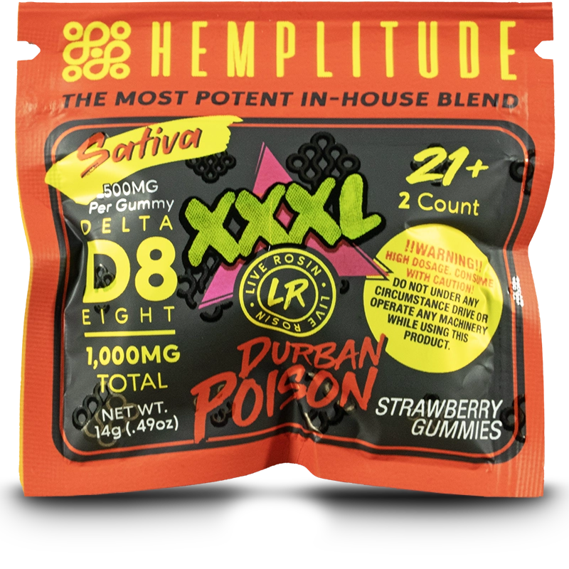 Hemplitude XXXL Gummies take things to a whole new level, transforming your favorite strains into powerful, mouthwatering edibles that deliver unmatched potency and flavor. Each gummy is loaded with 12x more Delta-8 than our originals and enhanced with premium live rosin, giving you the kind of experience that feels almost too strong to be legal. Available in three crave-worthy strain-inspired flavors—Bubba Kush (sour orange), Durban Poison (sour strawberry), and Wedding Cake (sour blue raspberry)—these gummies aren’t just potent, they’re also clean and conscious: 100% vegan, kosher, gluten-free, and crafted with organic ingredients. With only 3 grams of sugar and carbs per gummy, you get all the punch without the guilt. Choose from convenient single packs, six-count pouches, or full 18-count jars and discover why fans everywhere are calling these the ultimate heavy-hitter treat. When it comes to flavor, strength, and satisfaction, Hemplitude XXXL Gummies truly pack the punch.